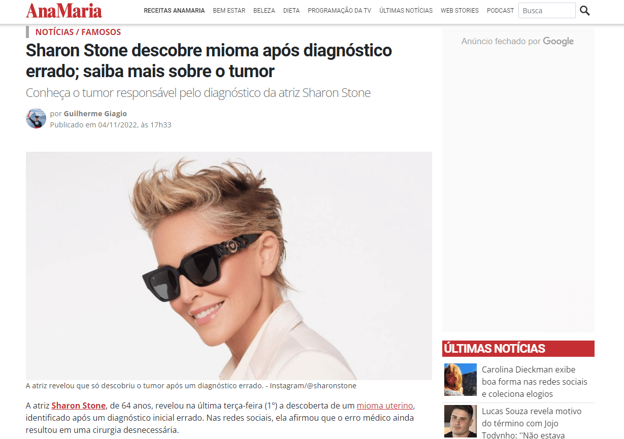 Confira a matéria completa no link: https://anamaria.uol.com.br/noticias/famosos/sharon-stone-descobre-mioma-apos-diagnostico-errado-saiba-mais-sobre-o-tumor.phtml